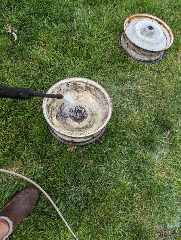 In the picture above, you can see I was hitting it hard with the power washer. Easy going at first with the big chunks, but getting down to the tiny bits took a lot of time and patience. And a lot of water. I finally got the three wheels as clean as they were going to get, and took them into my shop to get them to the next step.