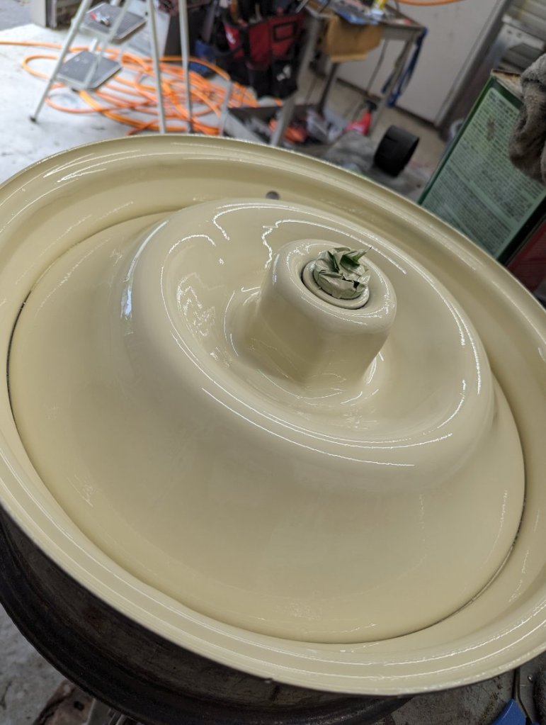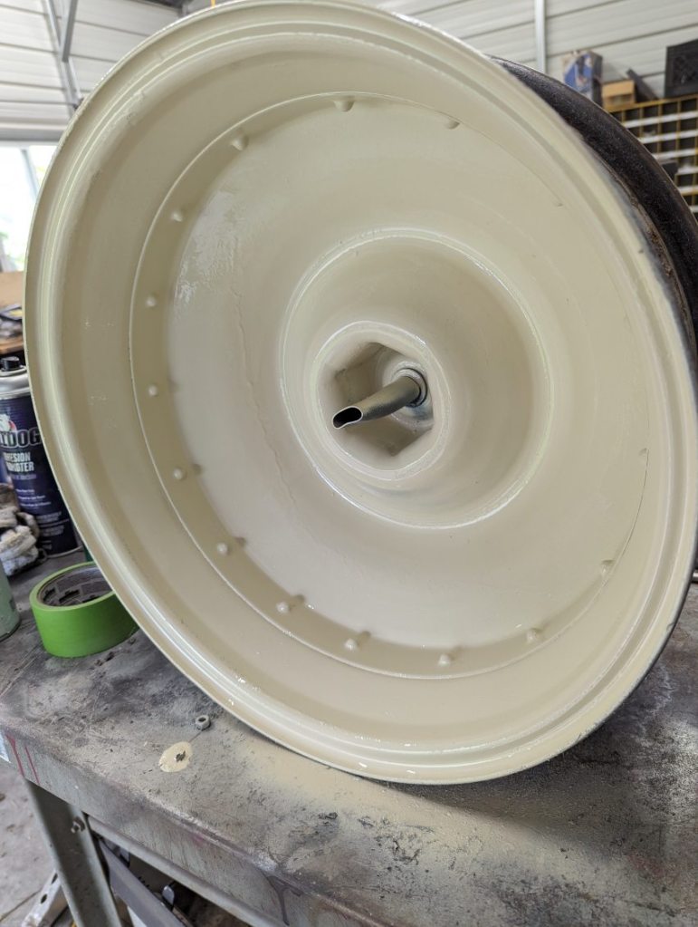 Anyway, here is the finished product. Yes, there’s a big run of paint on the back wheel. That is from the original paint underneath. Turns out every wheel had some drips from the factory! I refinished the back of one wheel extensively to use for the spare under the hood. Note that I taped off the wheel bolt. I hit it with the wire wheel too, and it is all nice and clean now.