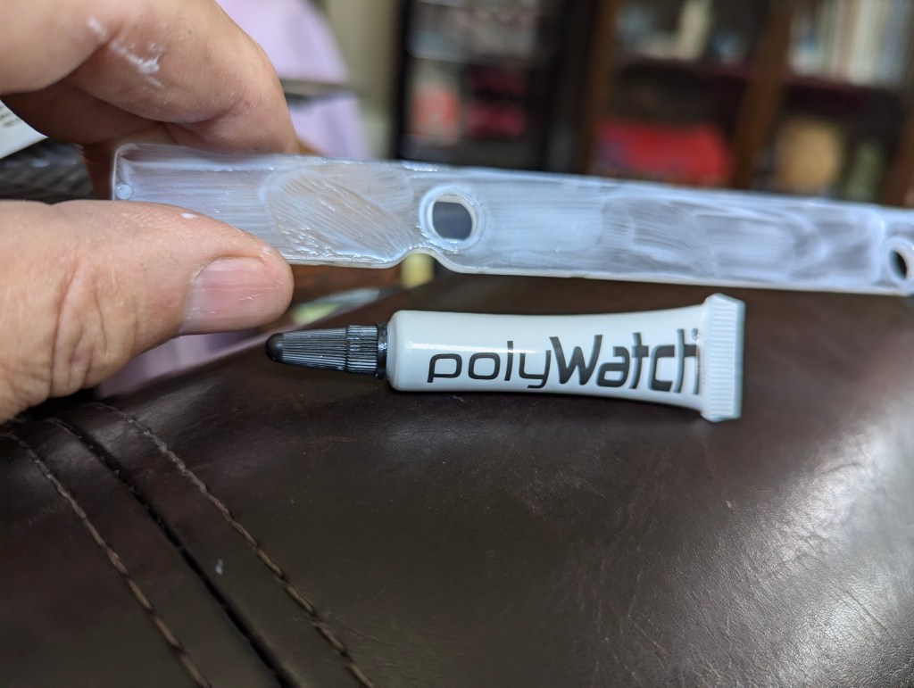 The clear plastic cleans up beautifully with polyWatch, which watchmakers use to get the scratches out of crystals. Stay away from the painted bits, because they will come right off and then you’re hosed.
